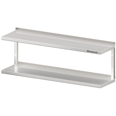 Das zweistufige Edelstahl-Wandbord mit stabilen Winkelkonsolen schafft zusätzliche Ablagefläche direkt am Arbeitsplatz – hygienisch, robust und leicht zu reinigen. Gefertigt aus ferritischem Edelstahl AISI 441 (optional AISI 420), eignet es sich perfekt für den dauerhaften Einsatz in professionellen Küchen.
