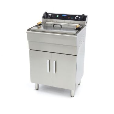Die elektrische Fritteuse 35L ist eine vielseitige Fritteuse und für den täglichen Gebrauch geeignet. Die Friteuse hat eine Fritteuse von 35 Litern mit einem Wasserhahn, so dass Sie das Öl leicht ersetzen können. Die Fritteuse 35L ist sauber mit abgerundeten Ecken versehen und mit einem Deckel versehen, um Ölspritzer zu vermeiden. Zusammen mit dem ergonomischen Design der Friteuse sorgt dies für angenehmes und sicheres Arbeiten. Das Edelstahlgehäuse, das Auffanggitter, die Fritteuse und der Korb sind leicht zu reinigen. Die Fritteuse mit 35 Litern eignet sich zum Frittieren großer Mengen von Lebensmitteln.
