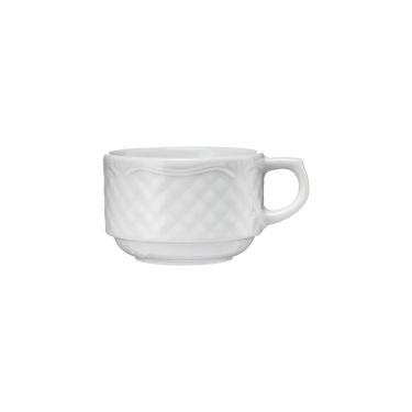 Die kleine Tasse für Kaffee- oder Tee ist Bestandteil der umfangreichen Porzellanserie Aphrodite. Das elegante, von geschweiften Linien und stilisierten Blättern gerahmte Waffelrelief machen das Geschirr zu einem Blickfang auf Ihrer stilvoll gedeckten Tafel. Das umfangreiche Sortiment des Services Aphrodite bietet eine Vielzahl an variabel einsetzbaren Geschirren. Stellen Sie ganz nach Ihren Bedürfnissen die perfekte Grundausstattung für Ihre Restauration zusammen und profitieren Sie von den vielen Vorteilen. Sie haben die Wahl zwischen unterschiedlichen Tellergrößen, Tassen, Schalen, Servierplatten und vielen Zubehörartikeln. Das hochwertige Reliefporzellan ist stoß- und abriebfest, verstärkte Ränder schützen vor Abplatzungen. Eine niedrige Wärmeleitfähigkeit sorgt für ein langsameres Abkühlen von Speisen und Getränken. Alle Einzelteile sind stapelbar und können platzsparend gelagert werden. Die gesamte Aphrodite-Porzellanlinie ist EU-standardisiert für alle gängigen Geschirrspüler. Bestellen Sie auch die zugehörige Untertasse (PZ5008160)! Professionelle Qualität von Lubiana, dem Spezialisten für Gastroporzellan.
