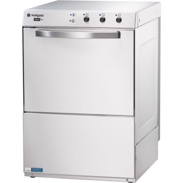 Gewerbepülmaschine Universal von Stalgast mit integrierter Klarspülmitteldosierpumpe und optional mit zusätzlicher Reinigerdosier-, Ablauf-, Klarspülpumpe - die universelle Spülmaschine für die Gastronomie